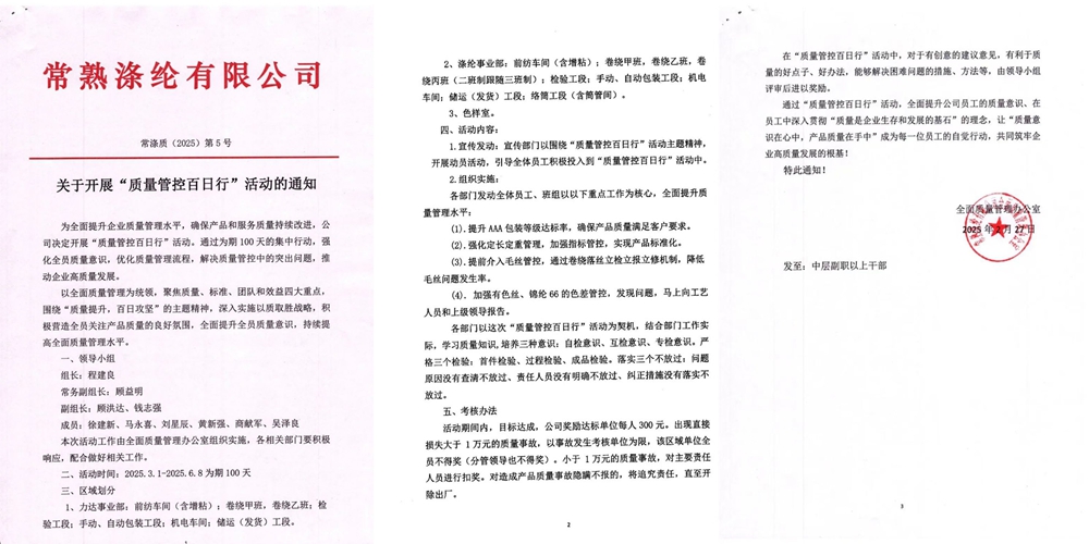 La qualitat és la línia de vida de les empreses i el polièster Changshu prendrà la "gira de cent de la qualitat de la qualitat" com a oportunitat per solidificar l'experiència i les pràctiques en les activitats en un mecanisme a llarg termini, construirà contínuament una base sòlida de qualitat i proporcionar als clients millors productes.